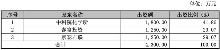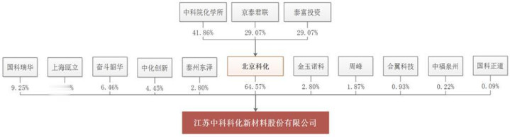 截至招股书签署日,北京科化持有中科科化64.57%的股份。北京科化的股权结构为:中科院化学所持股41.86%、泰富投资持股29.07%、京泰君联持股 29.07%。