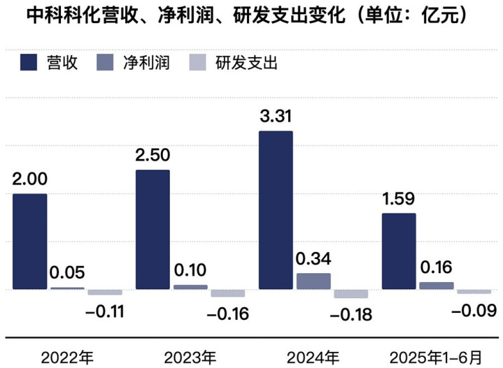 2022年、2023年、2024年、2025年1-6月,中科科化营收分别为2.00亿元、2.50亿元、3.31亿元、1.59亿元,净利润分别为474万元、0.10亿元、0.34亿元、0.16亿元,研发费用分别为0.11亿元、0.16亿元、0.18亿元、0.09亿元。